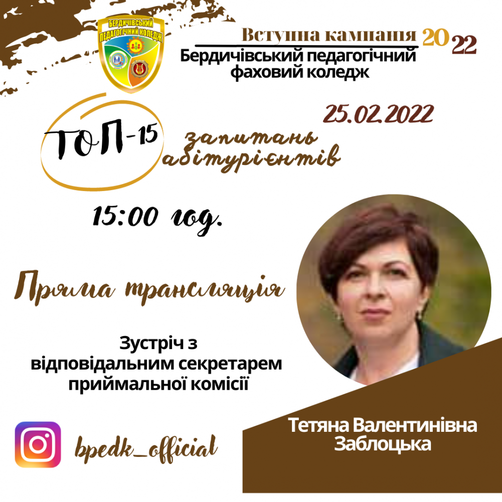 🏆На ТOП-15 запитань абітурієнтів відповідатиме відповідальний секретар приймальної комісії Тетяна Заблоцька.