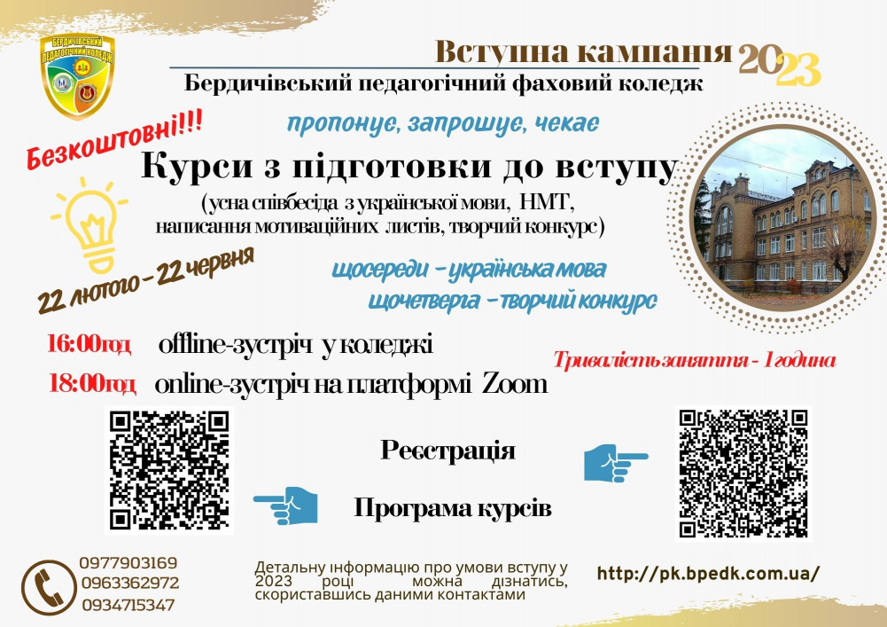 🏫Бердичівський педагогічний фаховий коледж розпочинає БЕЗКОШТОВНІ курси з підготовки до вступу (усна співбесіда з української мови, національний мультипредметний тест, написання мотиваційних листів, творчий конкурс на спеціальність "Музичне мистецтво").