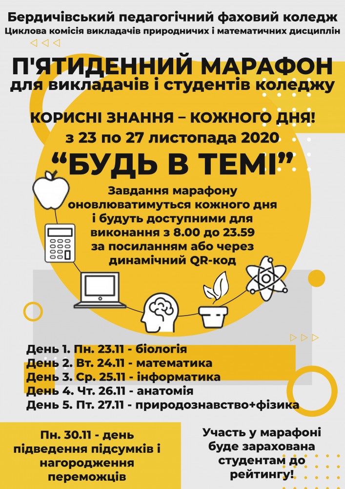 В умовах дистанційного навчання так мало розваг та цікавих масштабних заходів… Тому, не проґавте шанс взяти участь у п'ятиденному марафоні для викладачів і студентів Бердичівського педагогічного фахового коледжу "Будь в темі", який відбудеться з 23 по 27 листопада 2020 із врахуванням дистанційних форм роботи!