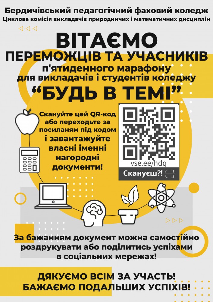 Переходьте за тим самим посиланням (або скануйте QR-код) в понеділок 30 листопада, щоб дізнатись імена переможців марафону, а також отримати власні іменні нагородні документи!