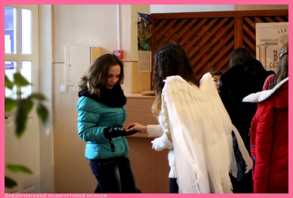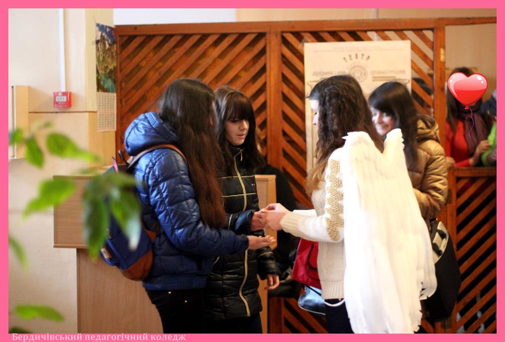 В останній місяць зими все більше хочеться любові, тепла та ніжності. Особливо в такий незвичайний день – День всіх закоханих, - який дає можливість в буденному житті знаходити час для високих почуттів. Це свято не оминуло і студентів Бердичівського педагогічного коледжу, куди з самого ранку завітали помічники Святого Валентина – Амури із символічними солодкими подарунками для усіх студентів. Море позитивних емоцій, окриленість на весь день – ось результати їх присутності в коледжі.