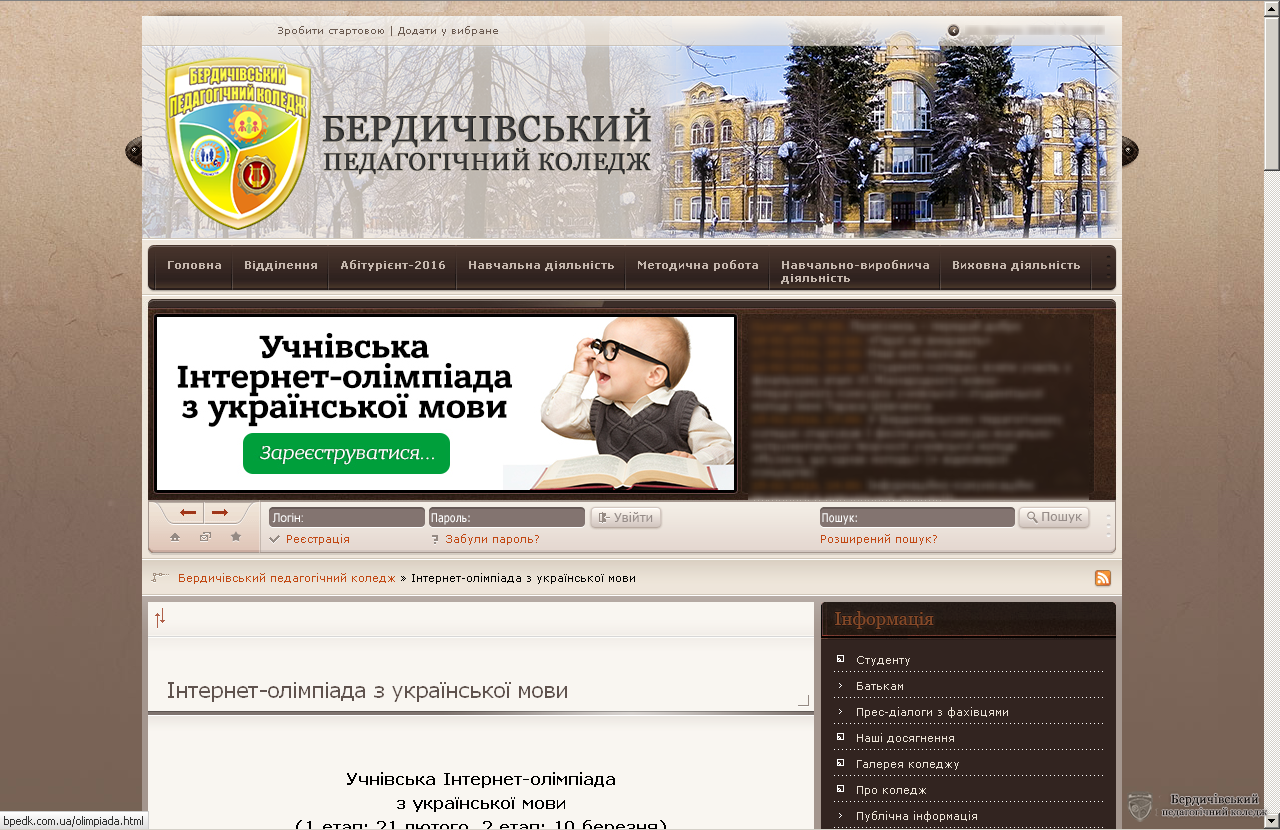 У Бердичівському педагогічному коледжі саме 21 лютого було проведено І тур Інтернет-олімпіади з української мови. Серед її учасників – учні шкіл Малина, Нової Борової, Народичів, Білої Церкви, Коростеня, шкіл Бердичівського району та ін.
