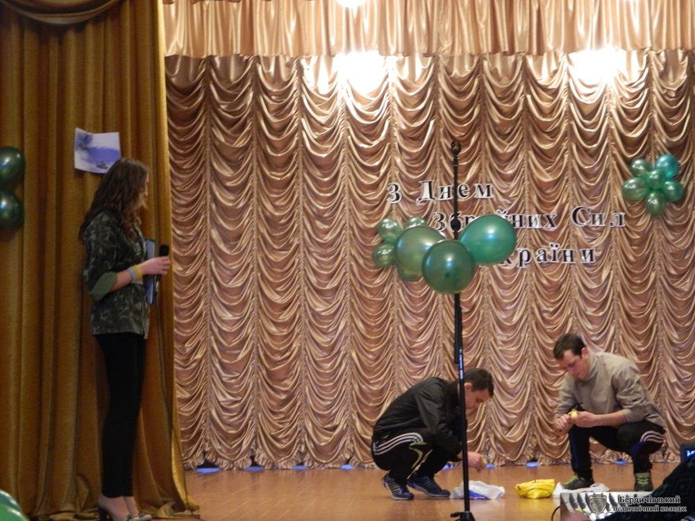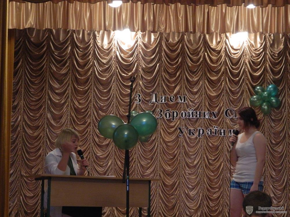 Бердичівський педагогічний коледж хоч і є закладом, в якому студентський та викладацький колективи в середньому на 85 % складаються з представниць прекрасної половини людства, проте вони ніколи не забувають про своїх захисників, свою опору, своє міцне плече. Ось і напередодні 6 грудня – ДНЯ ЗБРОЙНИХ СИЛ УКРАЇНИ, дівчата запросили чоловіків та хлопців свого закладу до святкової зали, аби урочисто привітати зі святом мужності та відваги.