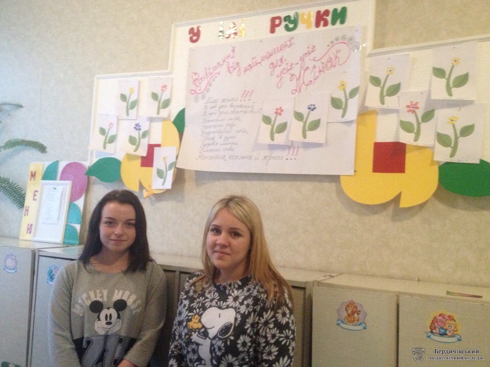 В ДНЗ №28 та №26 напередодні 8 березня дітвора традиційно виготовляє різноманітні подарунки для матусь – листівки, квіти. А ми, студенти ІІІ-А, вирішили приготувати з дітками смаколики у вигляді горішків та грибочків. На завершення разом з малятами намалювали привітальний плакат.