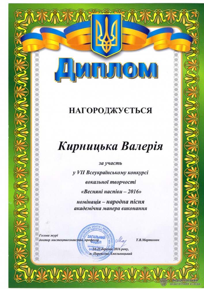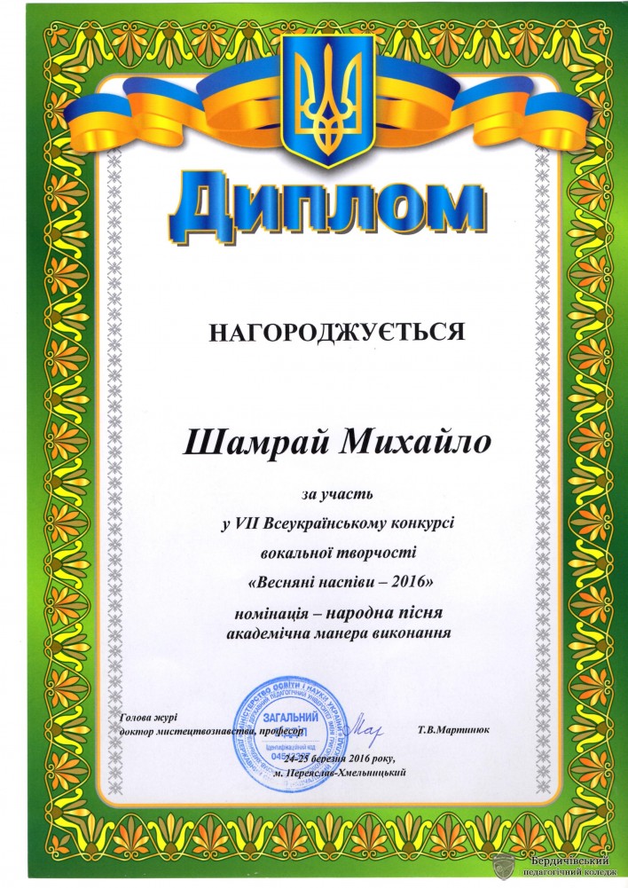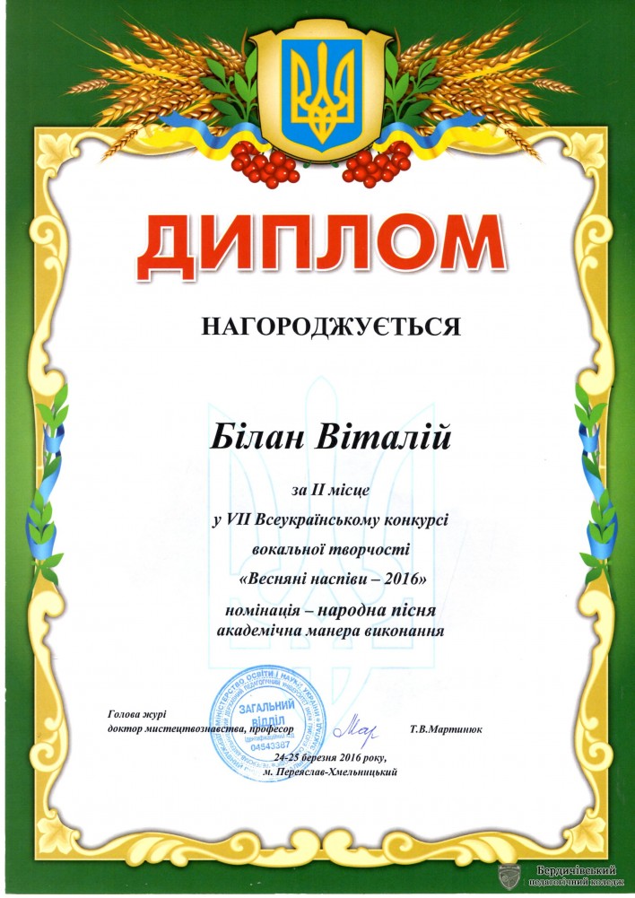 У мальовничому історичному місті Переяславі-Хмельницькому у стінах ДВНЗ імені Г.Сковороди, 24-25 березня відбувся VII Всеукраїнський конкурс вокальної майстерності «Весняні наспіви–2016», у якому взяли участь талановиті студенти Бердичівського педагогічного коледжу музичного відділу: Білан Віталій (III-М курс); Шамрай Михайло (III-М курс); Лоцька Вікторія (IV-М курс); Кирницька Валерія (IV-М курс).