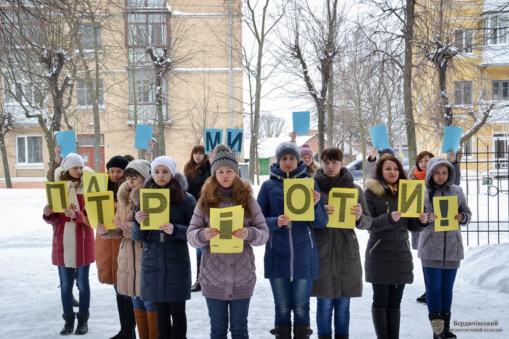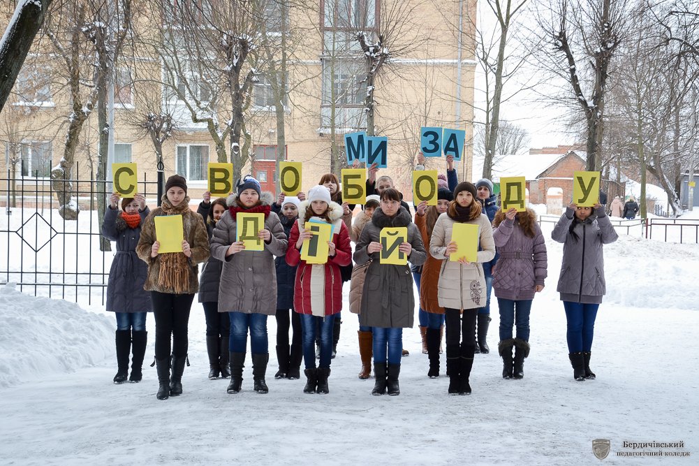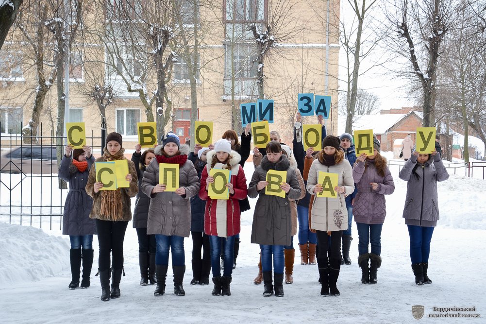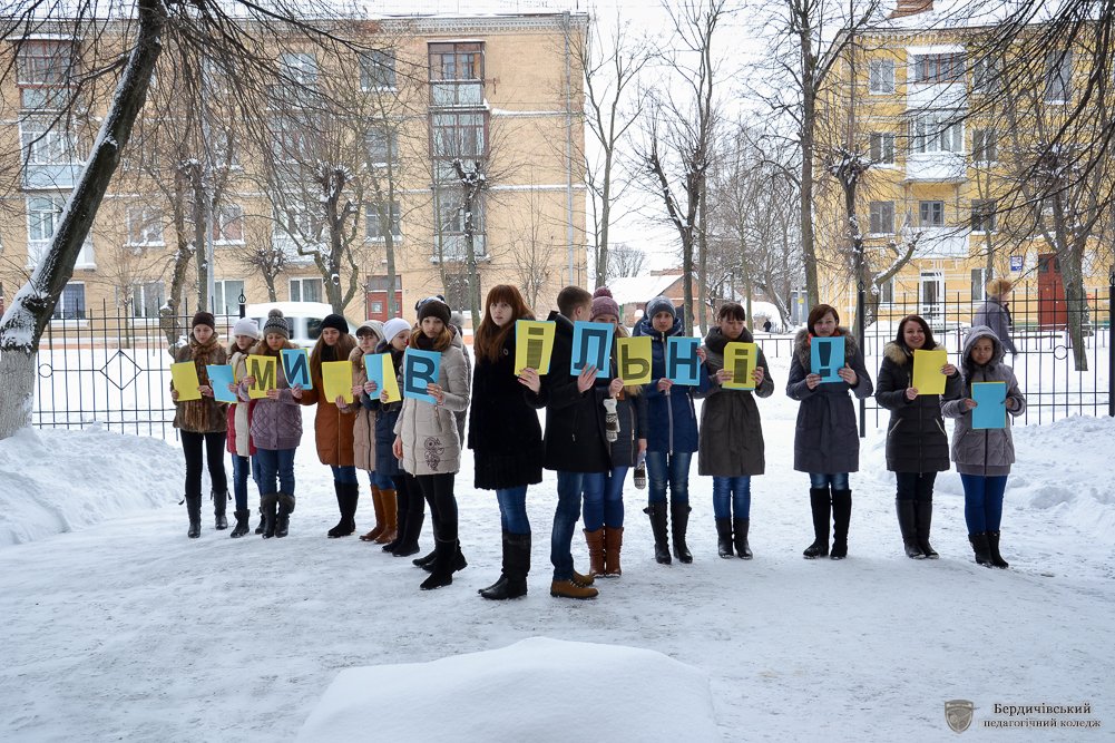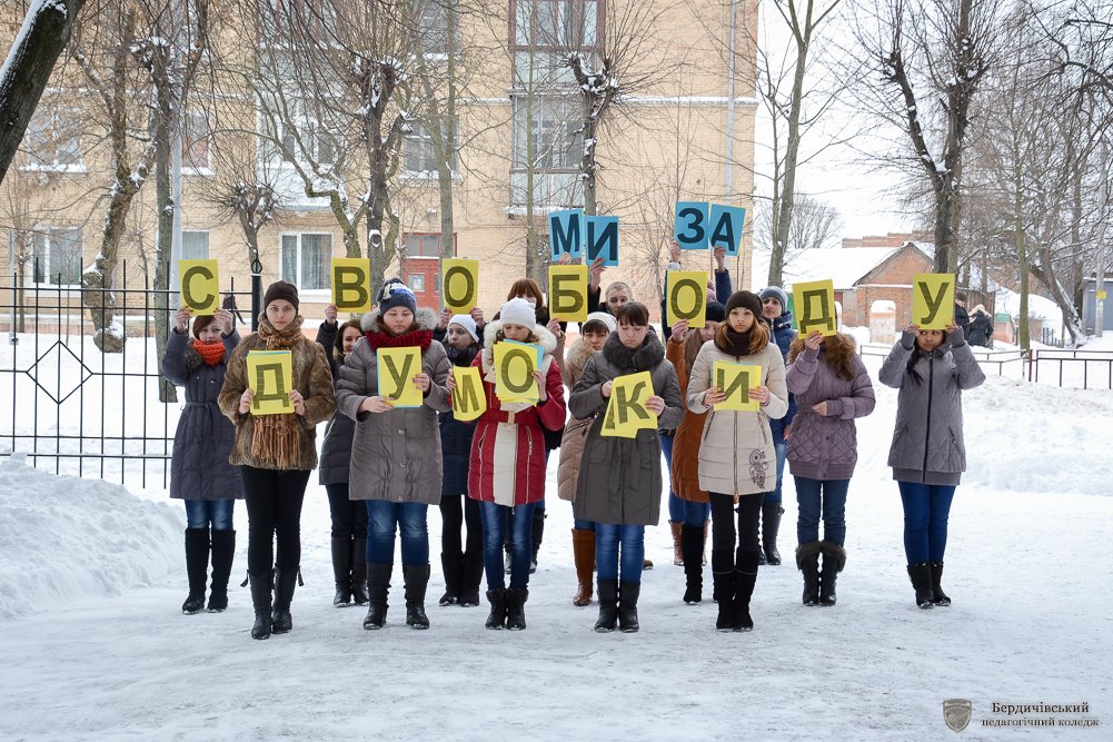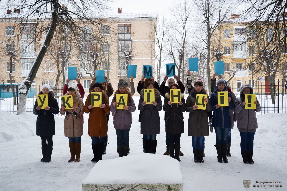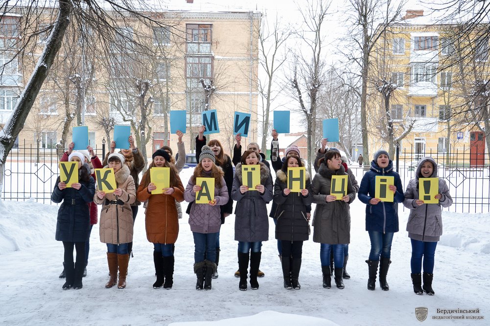 «Серця об’єднанні любов’ю до України» - флешмоб з такою назвою своєму студентству та перехожим міста у День соборності та свободи України організувала Студентська рада Бердичівського педагогічного коледжу. Власне в такій оригінальній формі актив коледжу вирішив розповісти та ще раз нагадати про ті кроки, які майже століття тому, зробила Україна, аби нині бути єдиною і неподільною, про ті сторінки історії, які сьогодні нам забезпечили державну цілісність, національно-етнічну інтеграцію, становлення українців як громадян своєї держави, гідних бути рівними з іншими націями та народами.