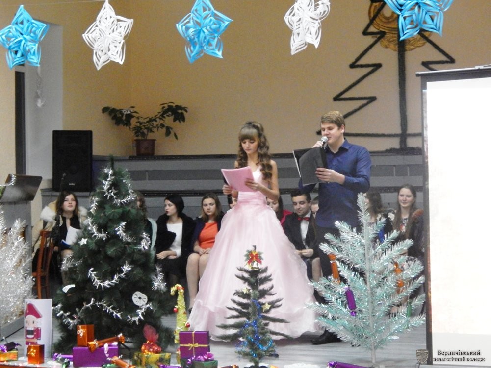Казкову новорічну атмосферу заходу допомогли створити сяюча вогниками і новорічними прикрасами святково вбрана зала; яскраве образне виконання студентами музичних творів; влучно підібраний до них відео- та фотосупровід на екрані; майстерне, емоційне озвучення казки у виконанні ведучих.
