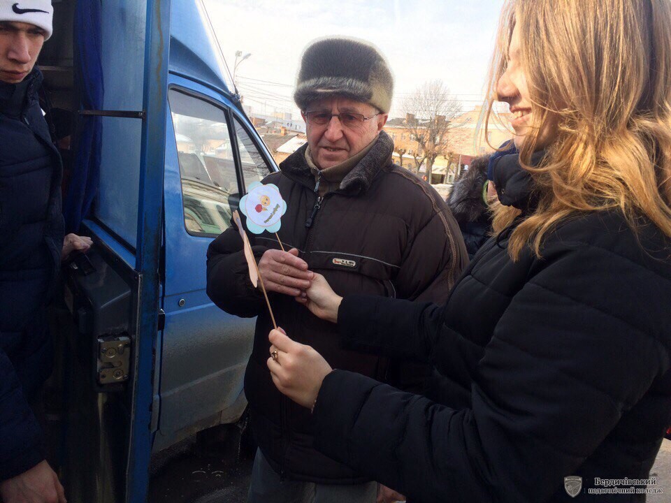 Приємні сюрпризи чекали і на пересічних перехожих. Власноруч зроблені квіти, теплі слова привітання та щирі обійми чекали на всіх, хто зустрічав галасливу компанію студентів БПК.