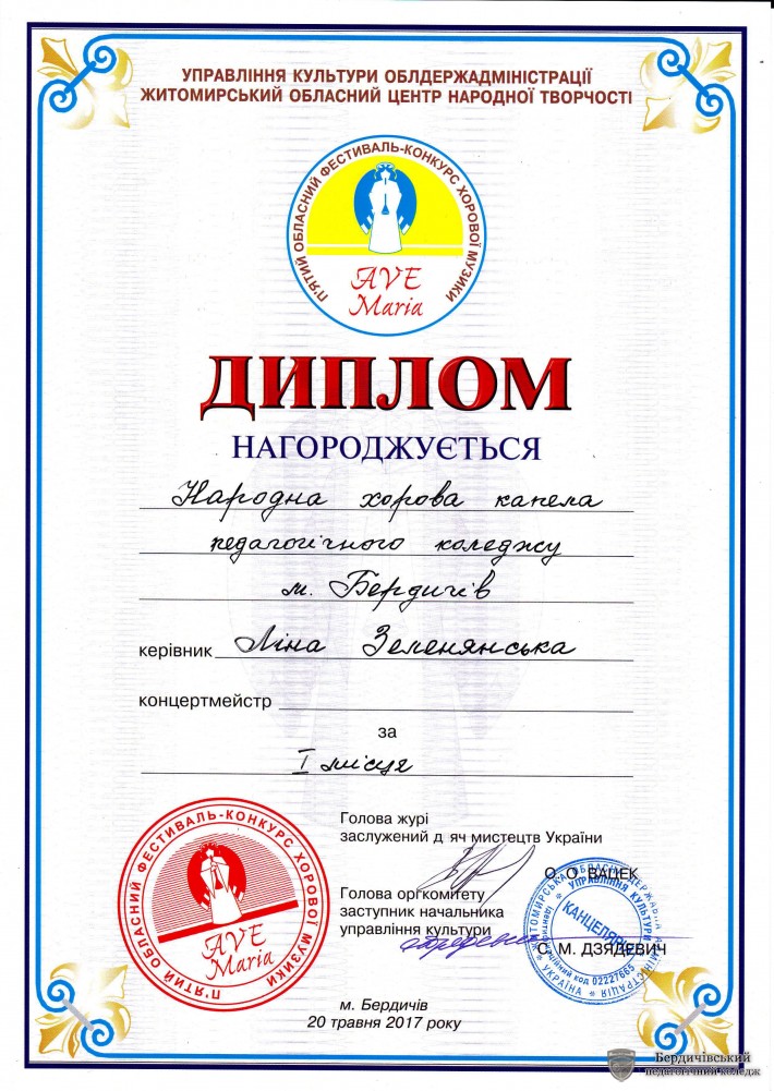 20 травня 2017 року в приміщенні Бердичівського міського палацу культури імені О.А. Шабельника відбувся V Обласний фестиваль-конкурс хорової музики «Аве Марія».