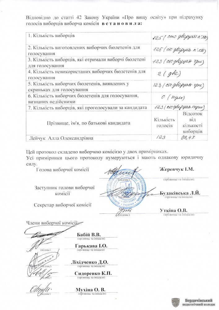 Результати виборів засвідчили: колектив віддав свою впевнену підтримку (100% голосів) кандидату на посаду директора Лейчук Аллі Олександрівні.