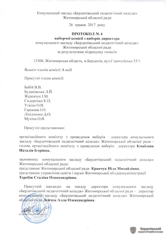 26 травня 2017 року ввійшло вагомою датою в історію Бердичівського педагогічного коледжу. Цього дня згідно процедури, визначеної Законом України «Про вищу освіту», коледжани обирали директора.