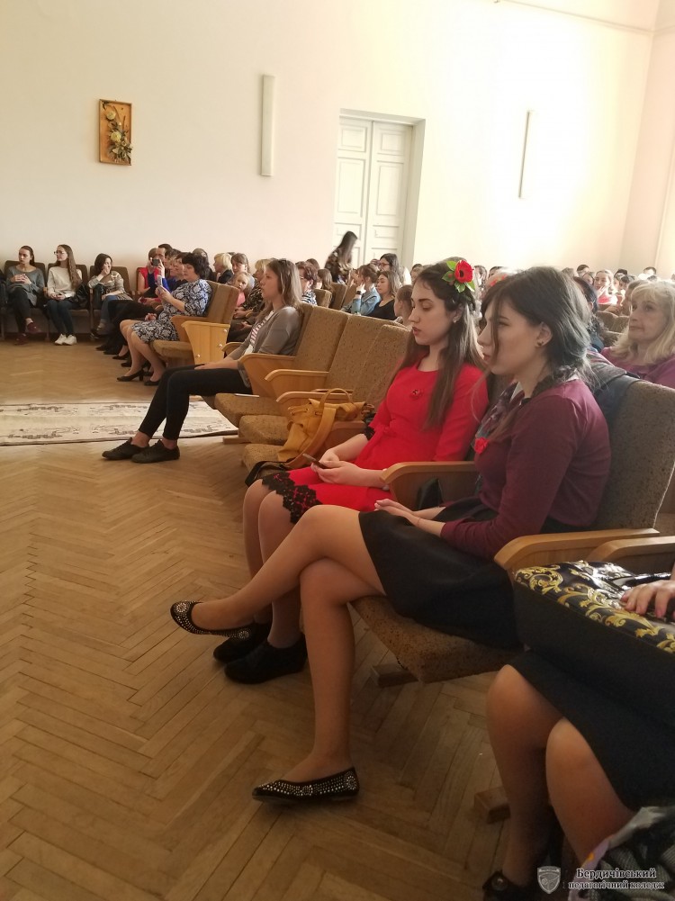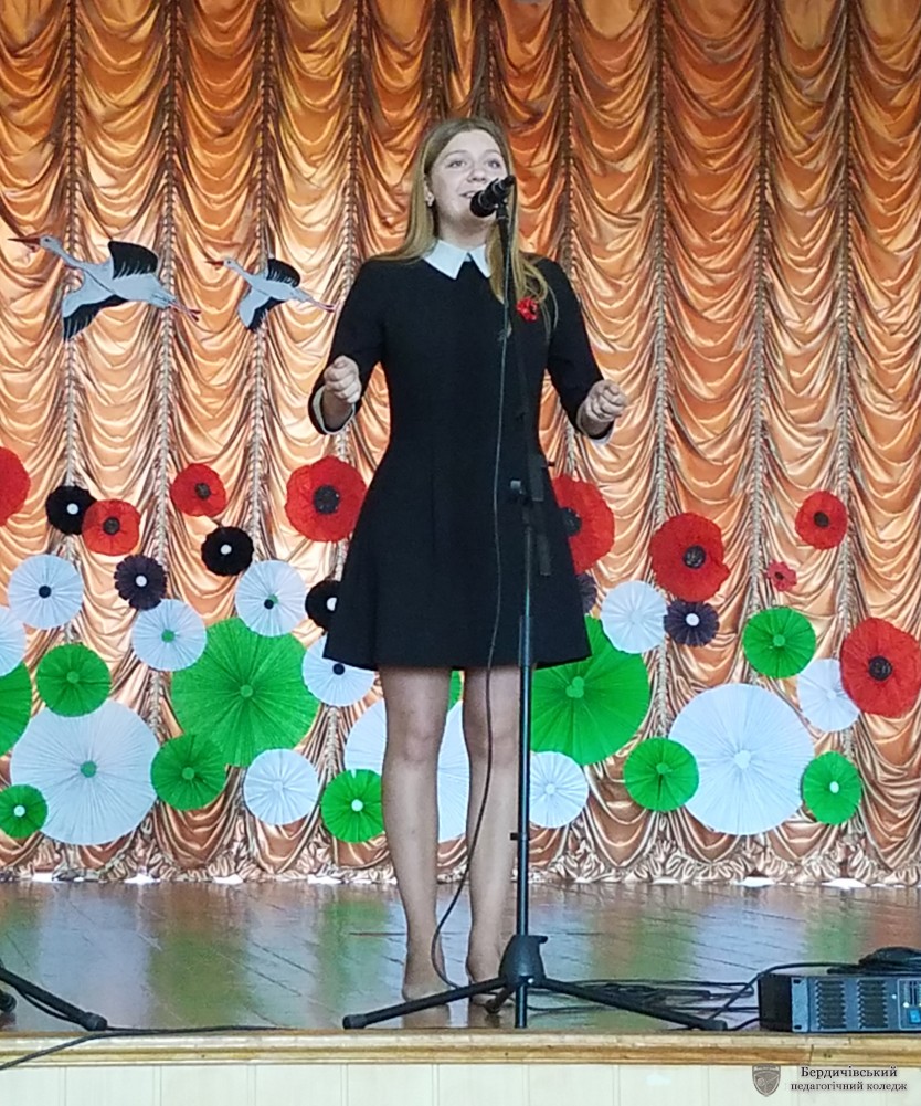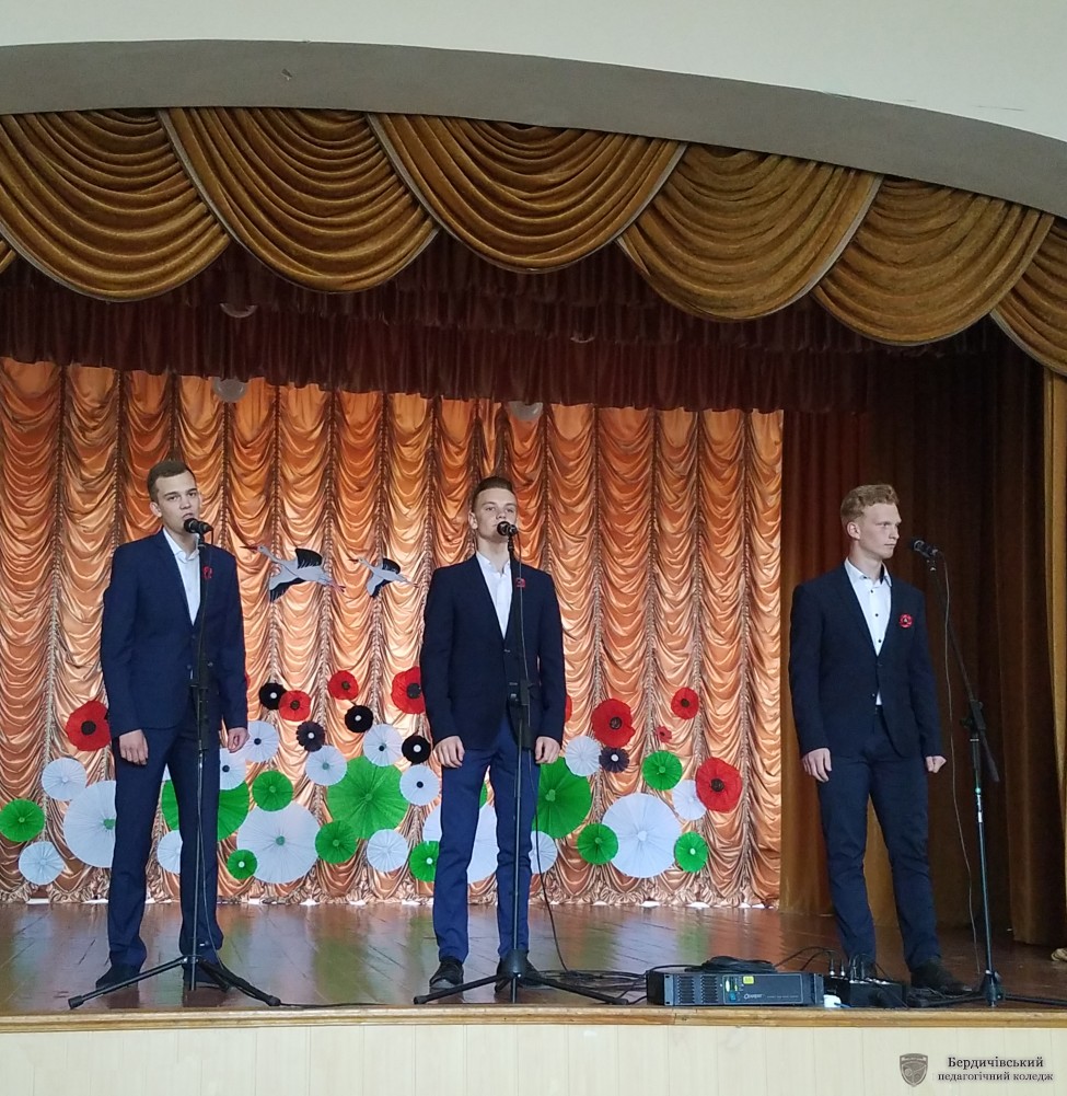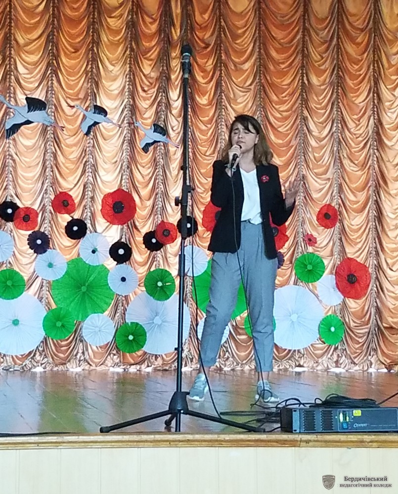 Заходи цього дня продовжились у актовій залі коледжу. На вечір фронтової пісні коледжан запросили талановиті студенти І курсу М групи разом із креативним керівником Н.О. Мельник.