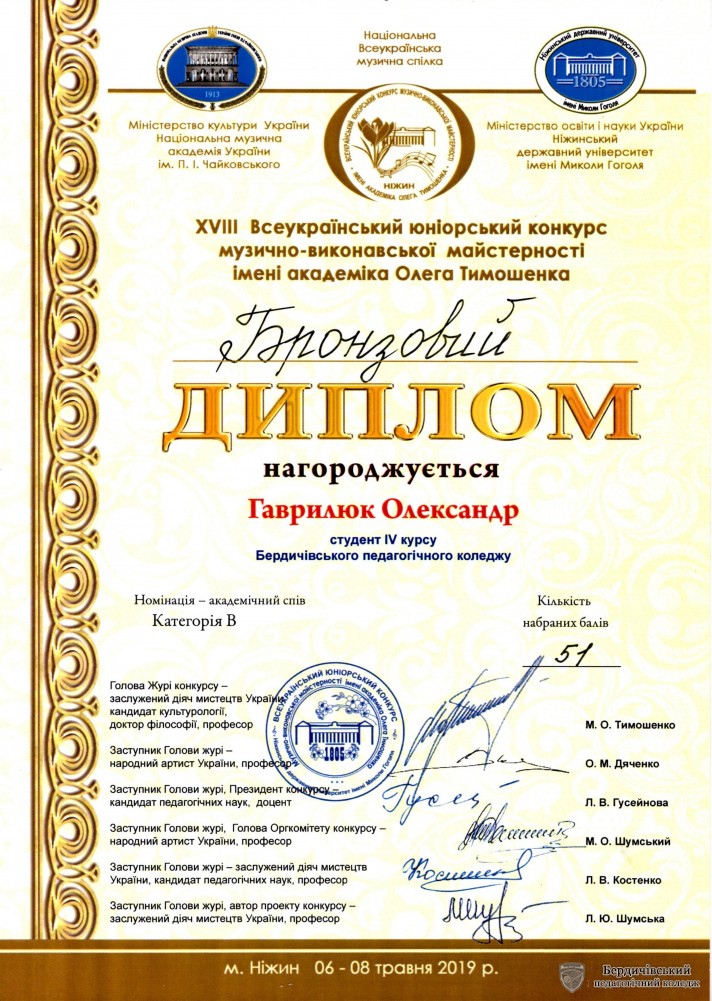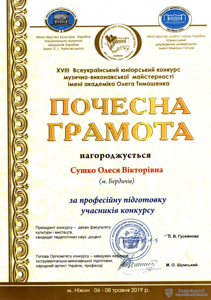 Із 6 по 8 травня 2019 року у Ніжинському державному університеті імені Миколи Гоголя пройшов ХVІІІ Всеукраїнський юніорський конкурс музично-виконавської майстерності імені академіка Олега Тимошенка. У конкурсі брали участь студенти музичних, музично-педагогічних, культосвітніх закладів вищої освіти I-ІІ та ІІІ-IV рівнів акредитації, учні Академії мистецтв, закладів початкової мистецької освіти: ДМШ, шкіл мистецтв, хорових шкіл, музичних студій тощо.