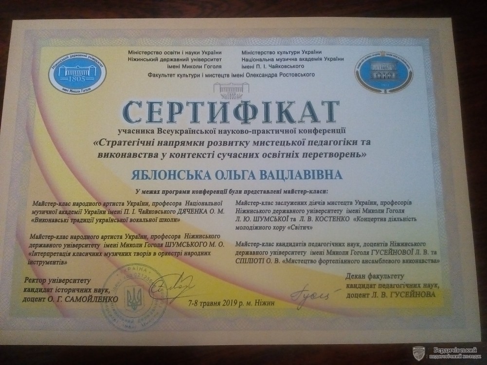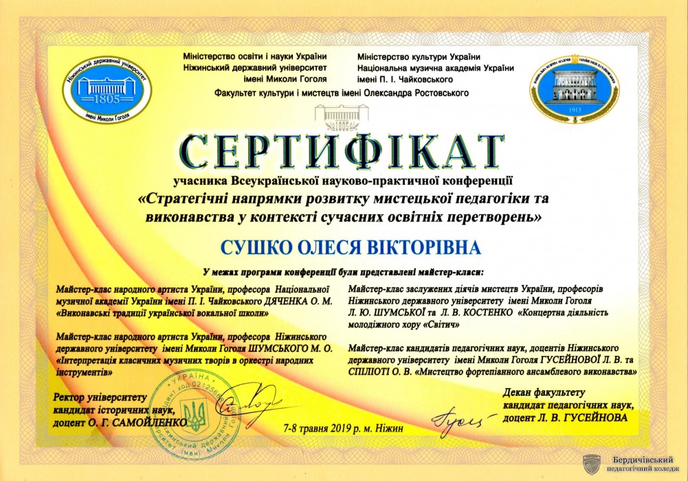 Також у межах ХVІІІ Всеукраїнського юніорського конкурсу музично-виконавської майстерності імені академіка Олега Тимошенка проходила Всеукраїнська науково-практична конференція «Стратегічні напрямки розвитку мистецької педагогіки та виконавства у контексті сучасних освітніх перетворень», учасниками якої були викладачі, концертмейстери, педагогічні та науково-педагогічні працівники навчальних закладів (факультетів, відділів) фахової мистецької освіти усіх освітніх рівнів. Участь у цій конференції взяли також викладачі Бердичівського педагогічного коледжу – Яблонська О.В., Сушко О.В., Сушко Д.К., Могільовцева С.Л.
