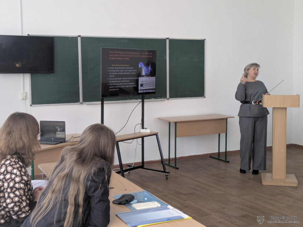 Ольга Володимирівна Концевич ознайомила із особливостями використання сервісів ШІ (Grammarly, Language Tool, Voyant Tools) для створення мотивації у студентів щодо вивчення української мови та літератури, формування мовної культури, а Ірина Миколаївна Жеревчук розповіла про специфіку використання ШІ (Chordify.net, Deep Piano, unMix, Moises) у підготовці фахівців спеціальності «Музичне мистецтво», а Наталія Іванівна Гордійчук запропонувала учасникам обговорити нові формати навчальних завдань для студентів.