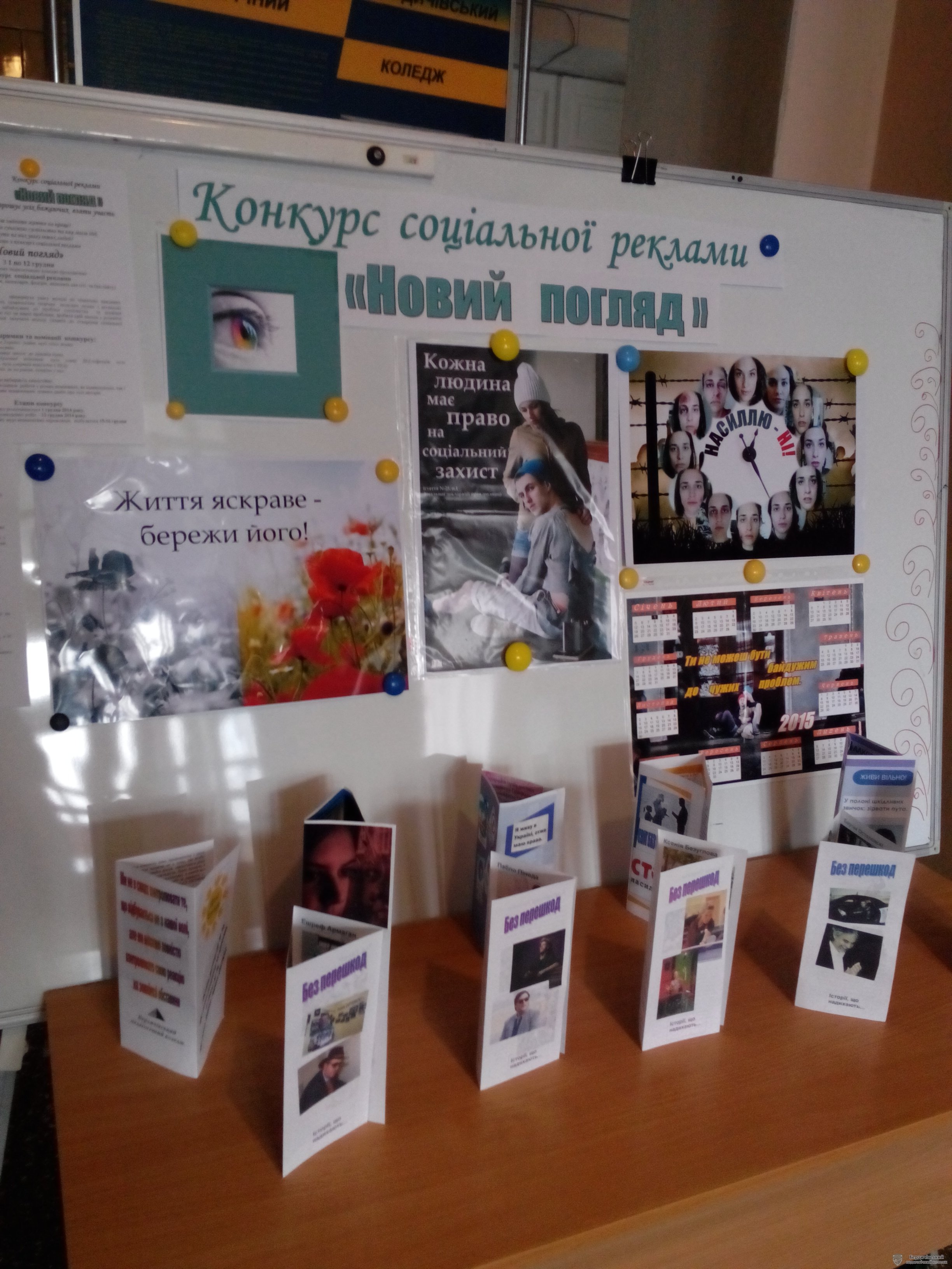 Аби залучити студентство до відзначення цих дат, аби привернути увагу молоді до соціально важливих проблем. у коледжі з 1 по 16 грудня проходив конкурс соціальної реклами «Новий погляд». Організатори конкурсу ставили на меті відшукати новий креативний погляд студентської молоді на глобальні, світові, віковічні проблеми, надати можливість талановитим, творчим молодим людям, небайдужим до проблем суспільства та держави, висловити своє ставлення до них, показати способи їх вирішення.